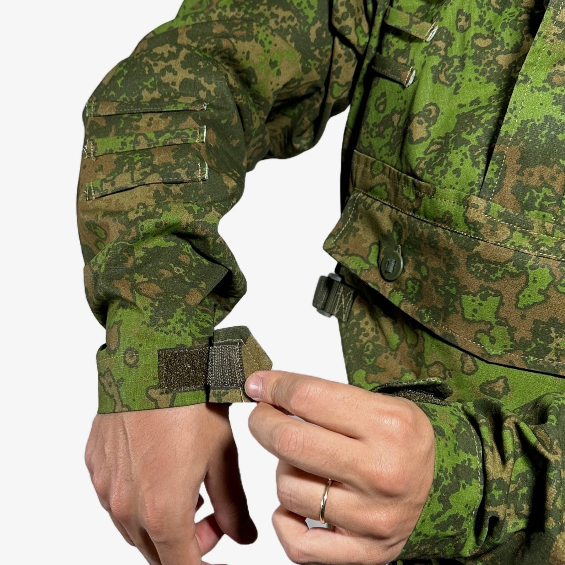 • Discreet Camouflage Loops — WW2 German smock–inspired loops across the smock for adding natural vegetation or custom camouflage without breaking the silhouette.